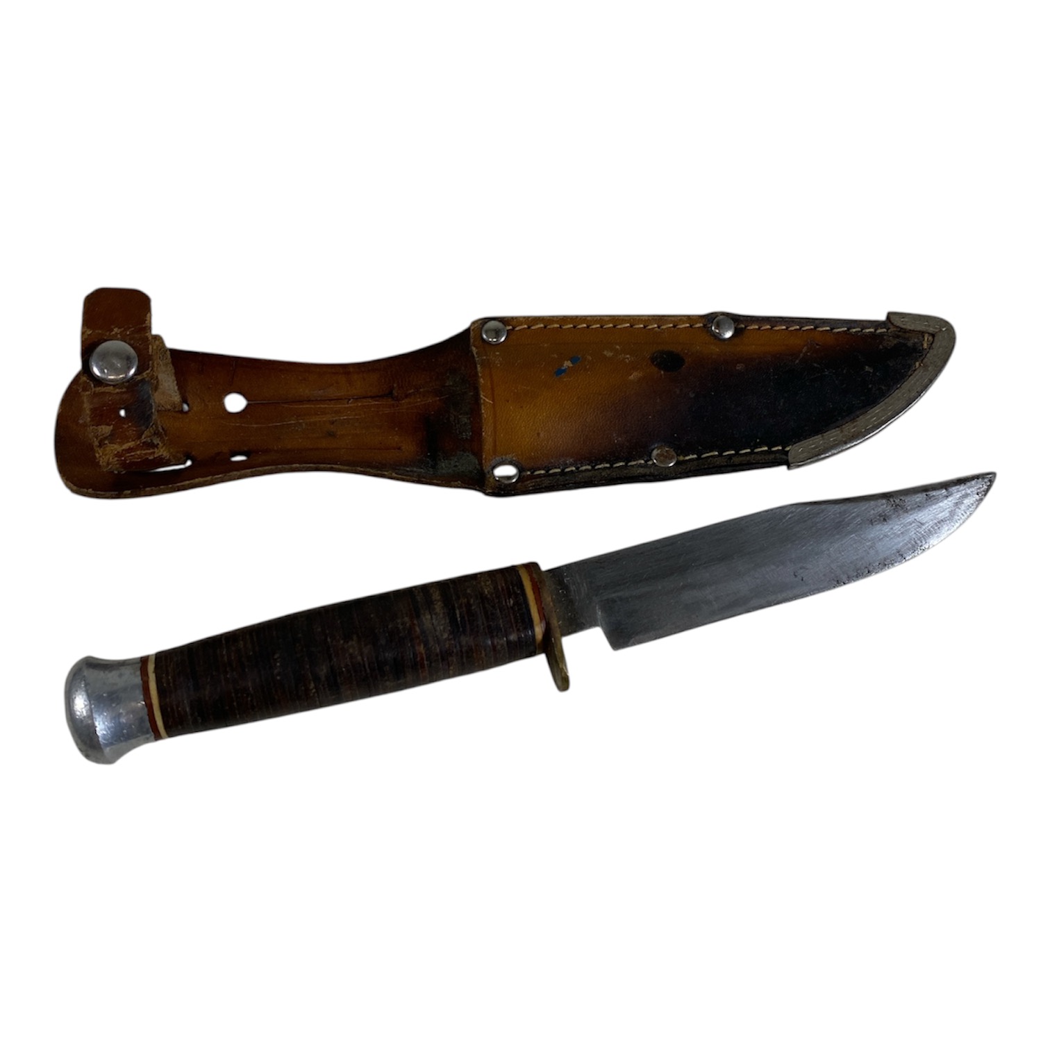 A restored vintage 4 1/2″ German hunting knife, with its sheath.
